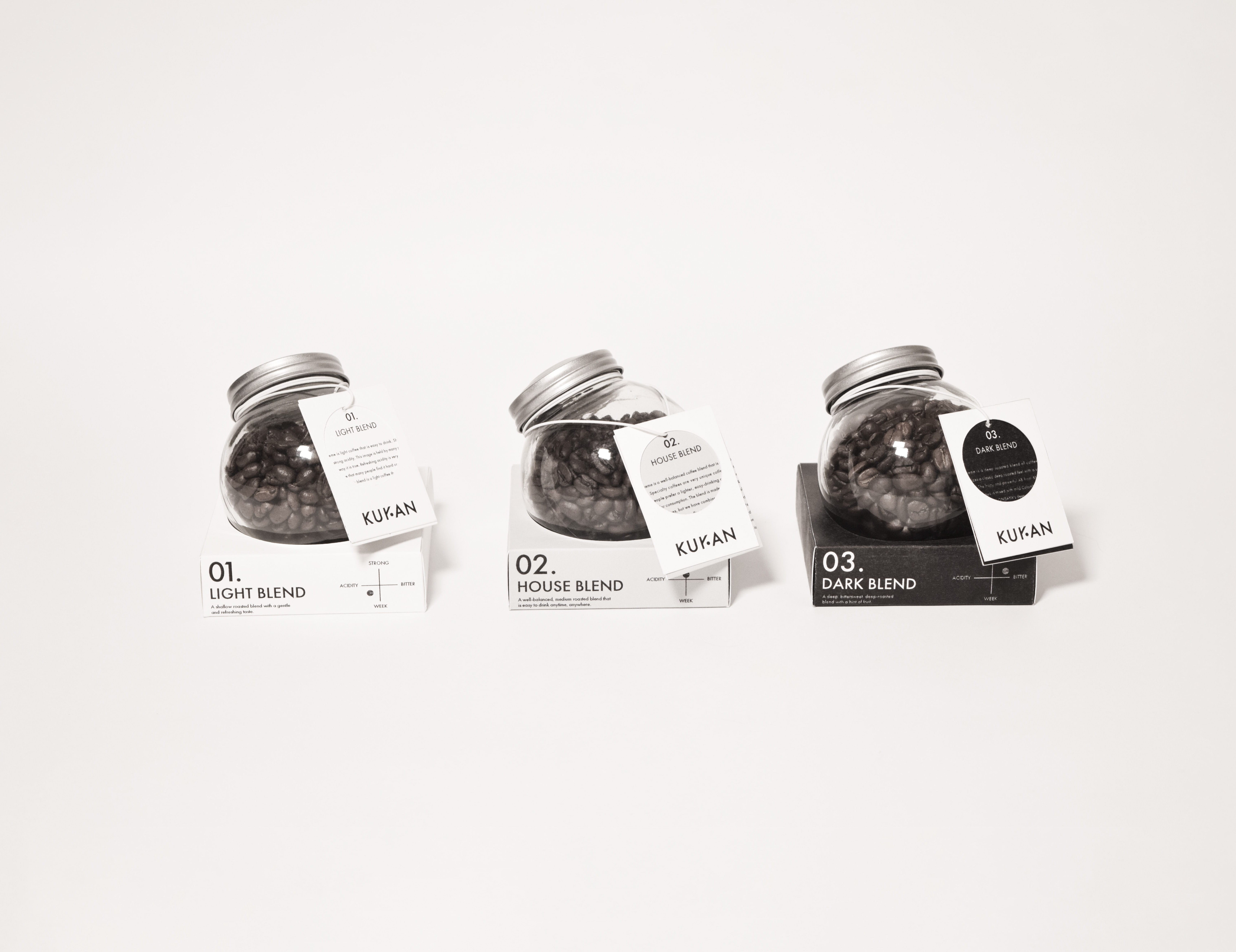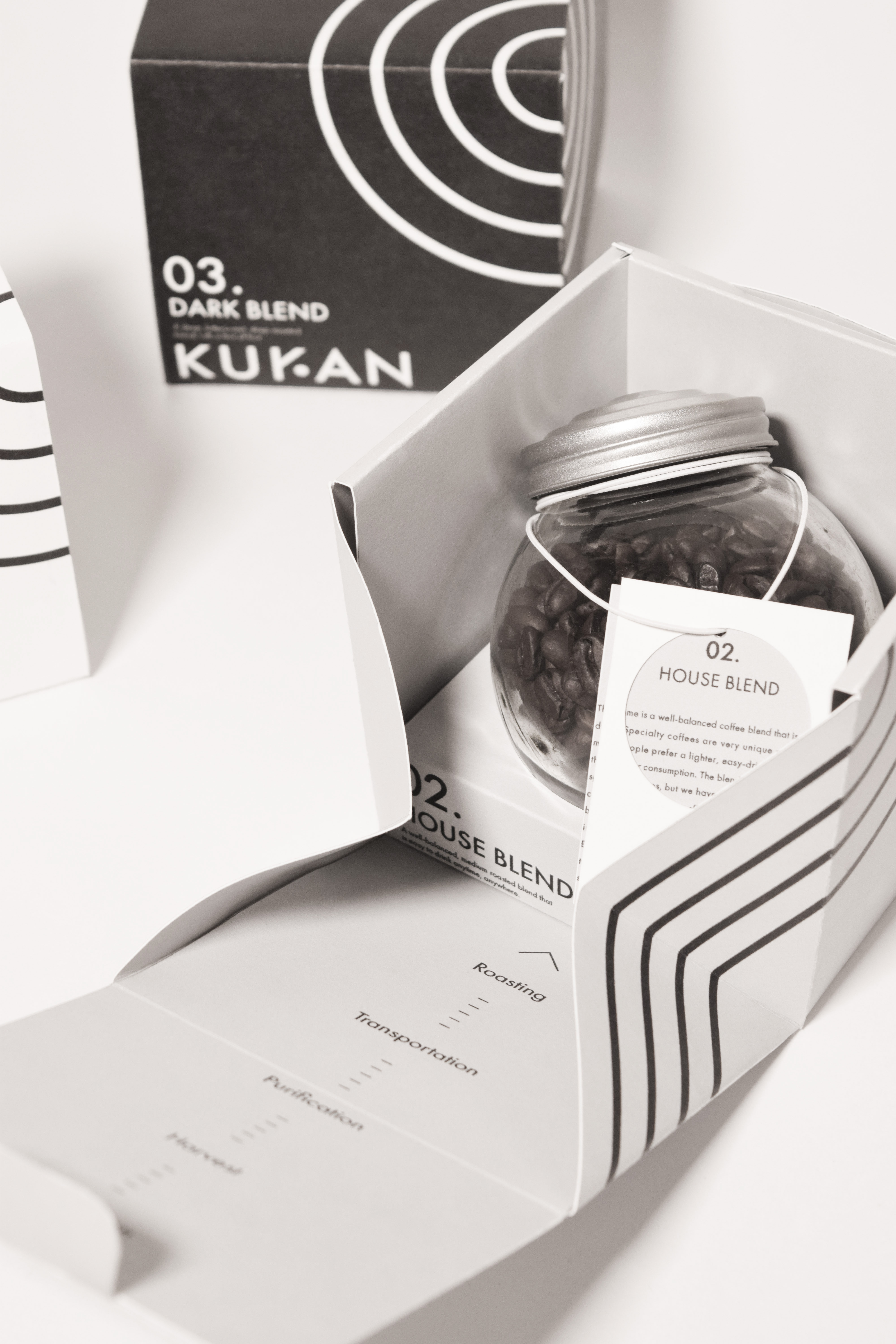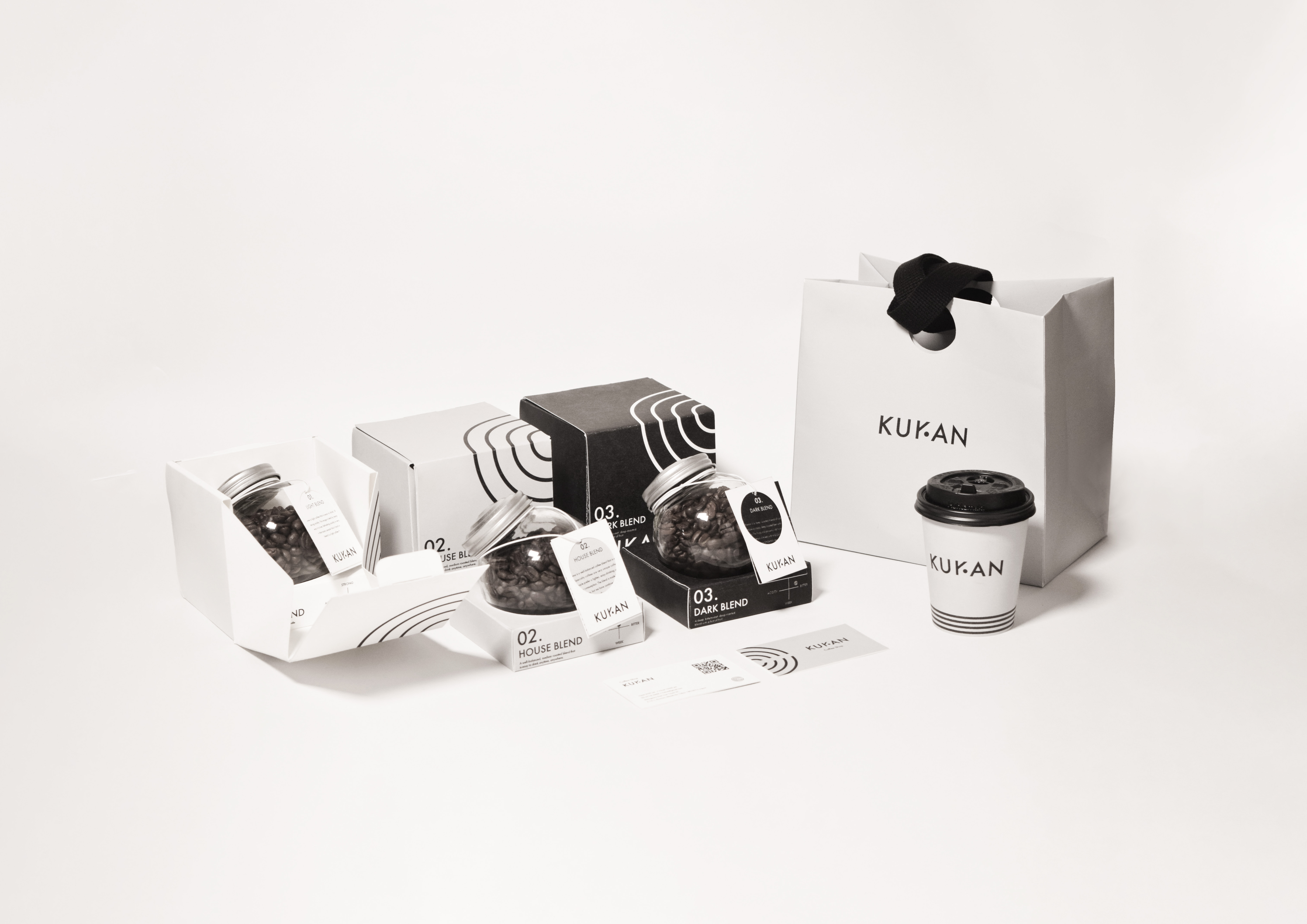 コーヒーショップ「KUKAN」のブランディングとして、ロゴとパッケージをデザインしました。ブランドコンセプトは「コーヒーを飲む時間を、集中できる空間に」です。会社に行く前やお昼休みに、集中するためにコーヒーを飲むことを想定して、オフィス街やデスクの殺伐とした雰囲気に合うようにスタイリッシュで無機質なデザインに仕上げました。「空間」から連想される球体や円のモチーフを、様々な場所に展開し人目に触れた瞬間にブランドが認識されることを目指しました。