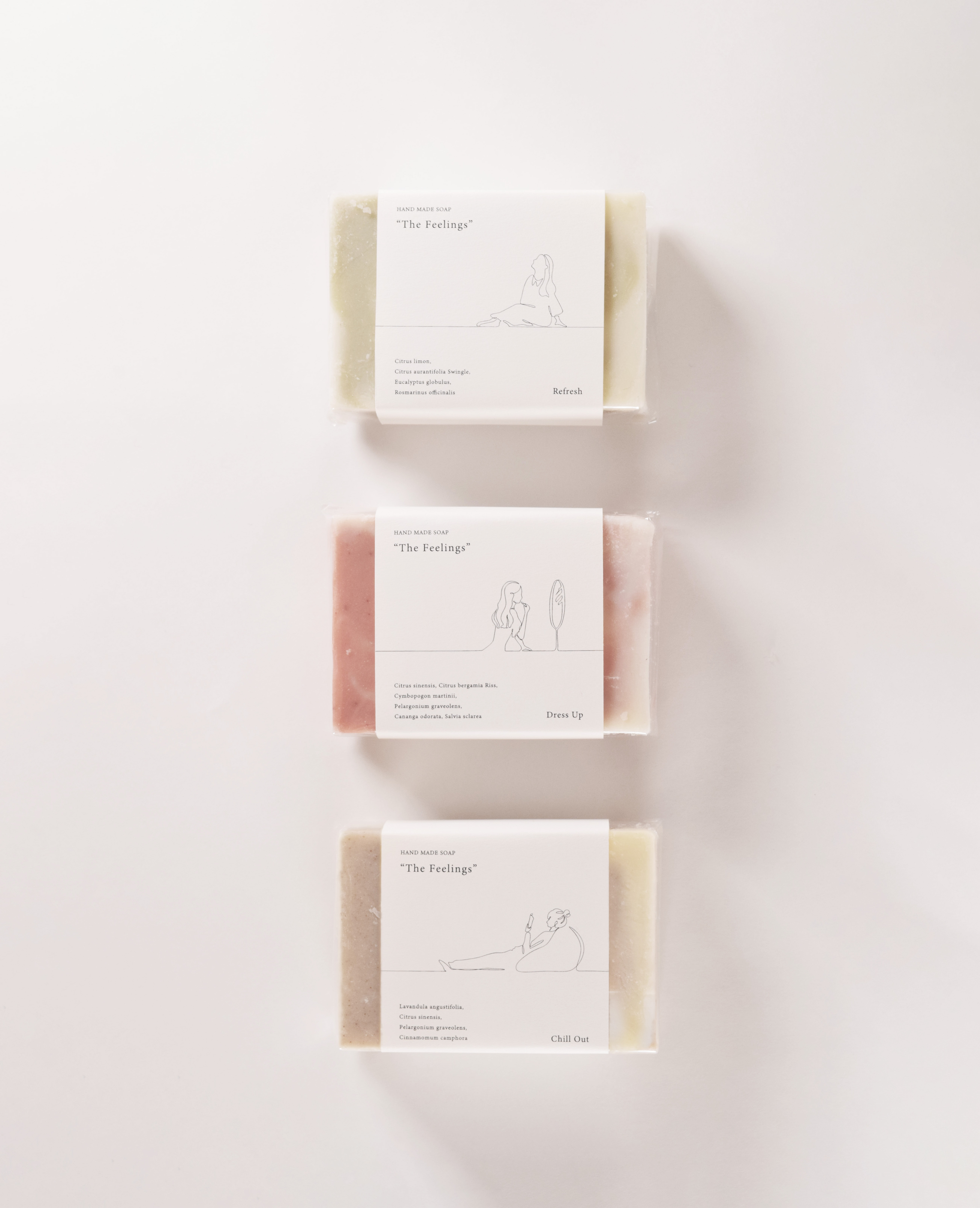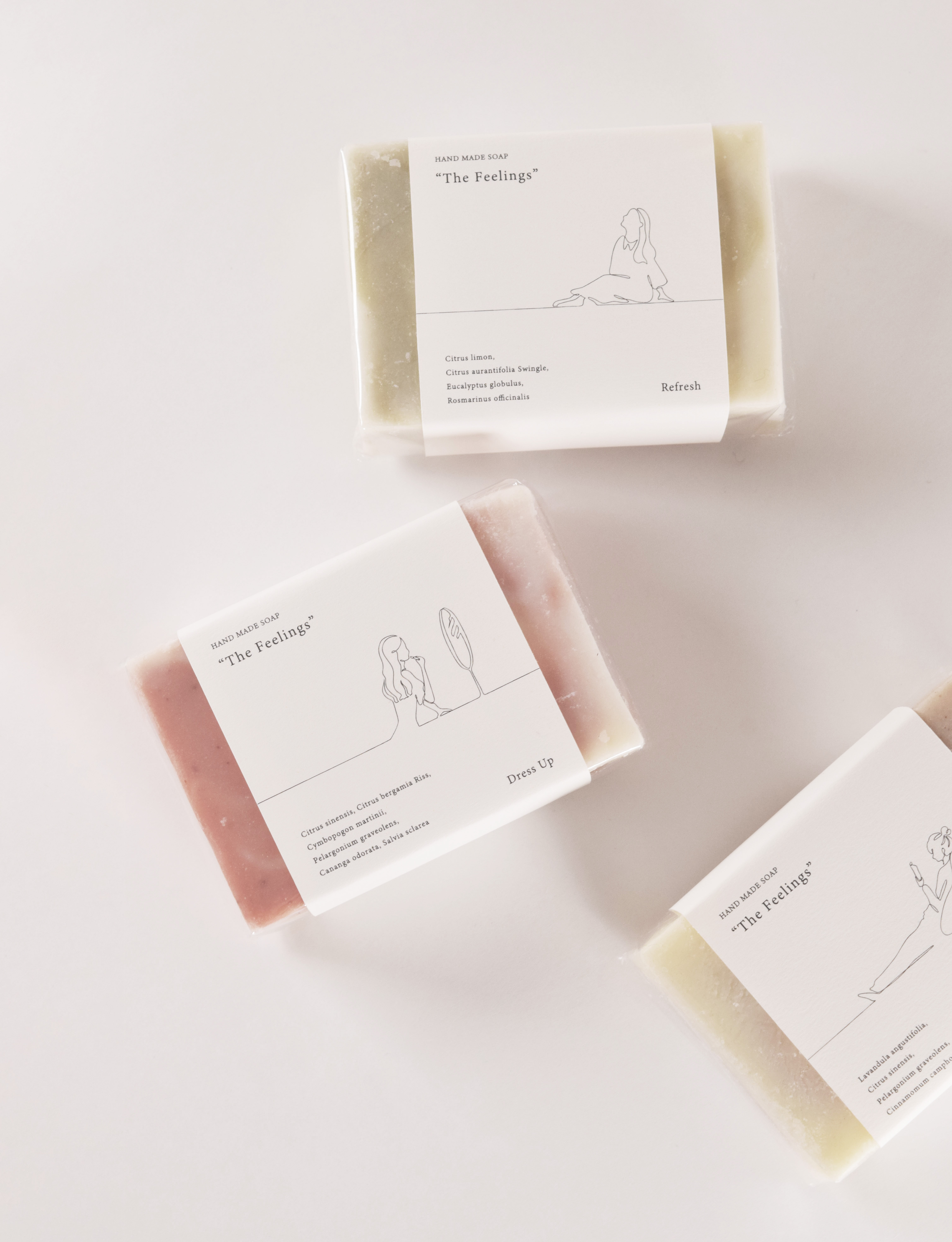 近年、手を洗うという行為がより身近なものになりました。家事、仕事、趣味、全てを一つの空間で行うことも多々あります。そんな中で私は手を洗うという行為が気持ちの切り替えに繋がりました。この石鹸にはそれぞれ異なる香りがついていて気分に合わせて選ぶことができます。今回は石鹸を手作りし、色や香りも合わせて考えました。石鹸らしく清潔感を出すために余白を多くとったパッケージには、一筆書きのイラストを使用して「 一続きの時間に切り替えを作る」というコンセプトを表現しました。